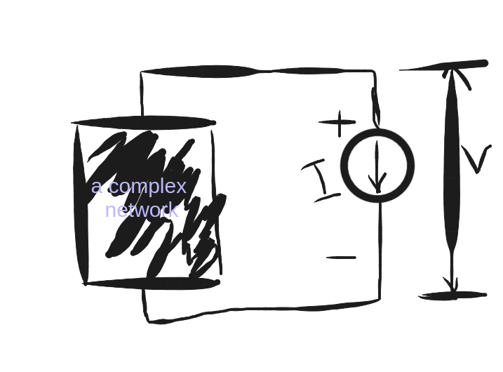 so we have a complex network of voltage sources, current sources and any possible element and we want to calculate v and i for a part, like the following figure.