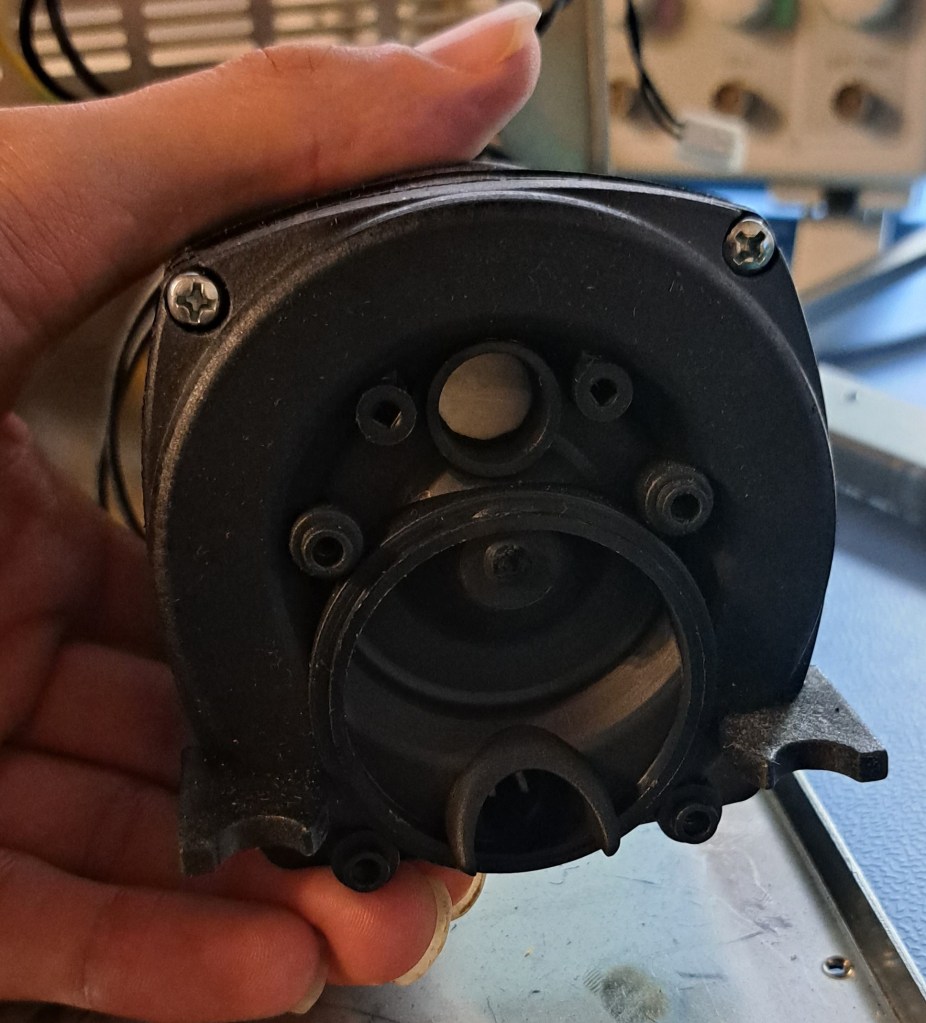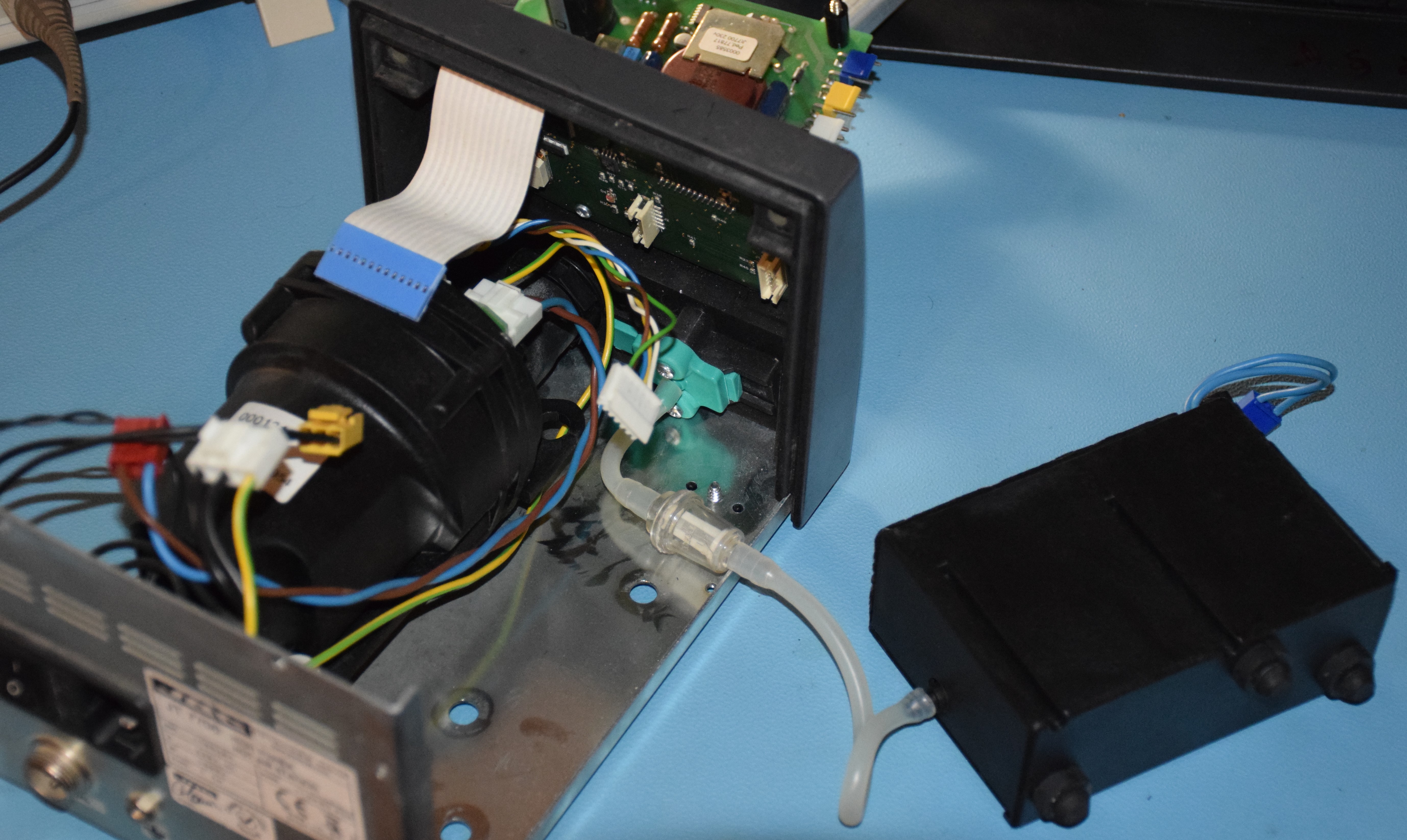 The suction device ( the black plastic block ) is fixed to the bottom sheet metal with only some rubber grommets, this device has only the two blue wires that control its power, and the suction port has no control of suction pressure which makes controlling it easy, inside the plastic box, I was imaging some kind of blower, but that was not the case.