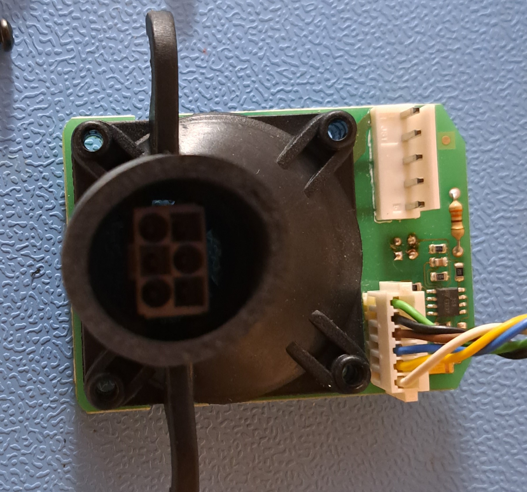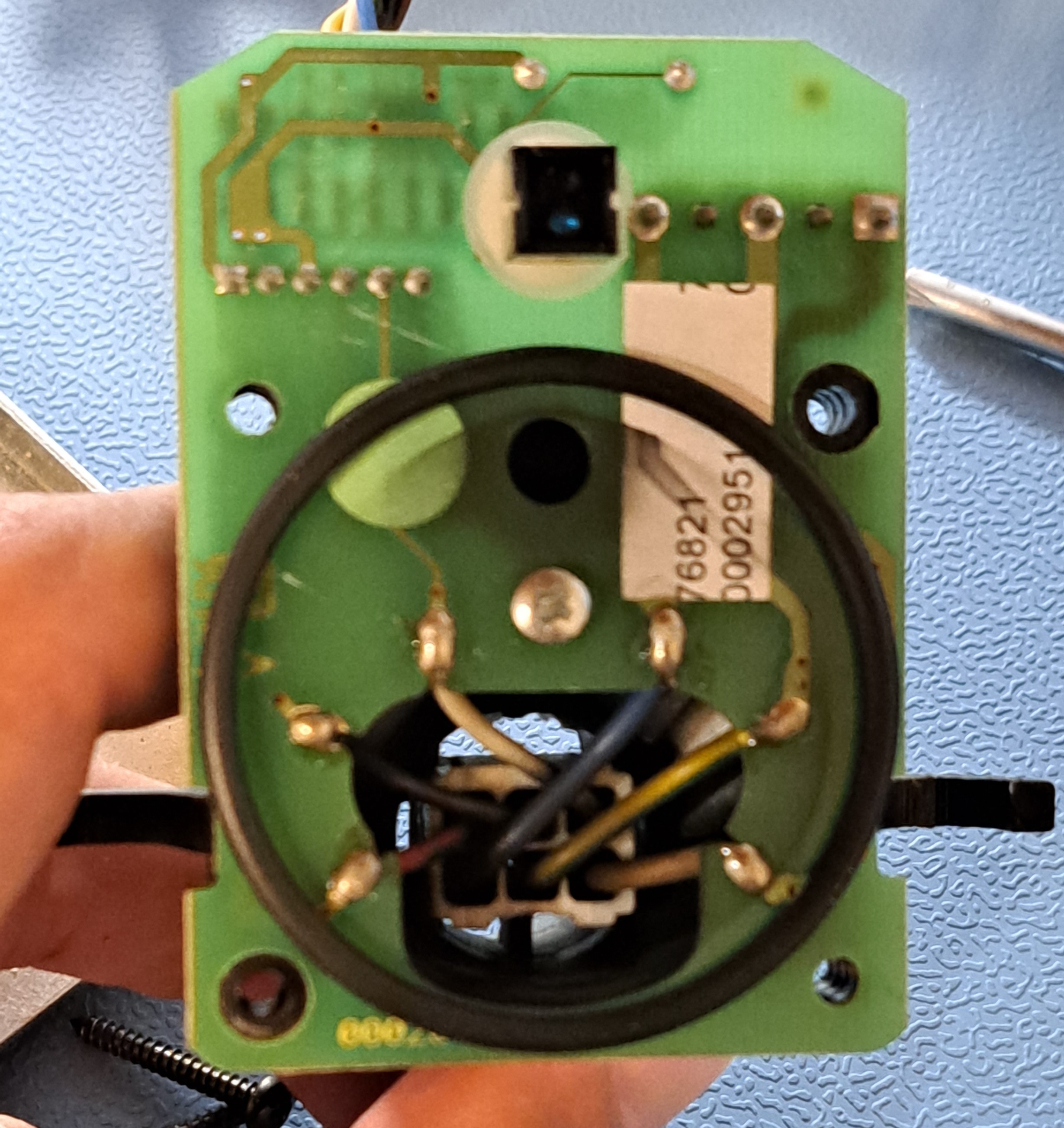 The blower itself has two openings, the top one is where the black part is in the third PCB mate, this is an IR emitter-receiver duo, probably either for sensing the filter quality ( black means bad, with means good), the second opening is for airflow.